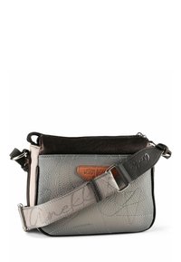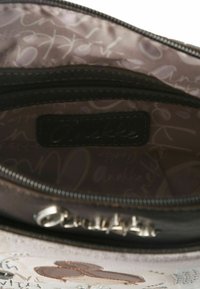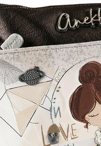 Umhängetasche mit einem Cartoon-Mädchen, geometrischen Mustern, dem Text "Verliebt in Wissen" und verstellbarem beigen Riemen mit Metallschnalle.