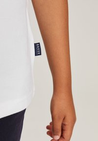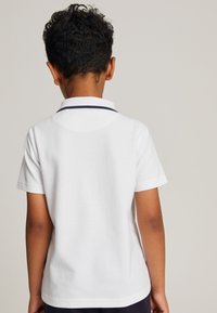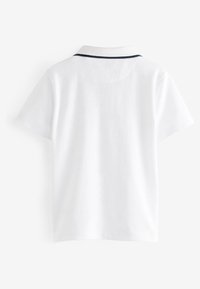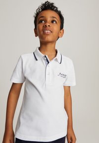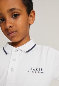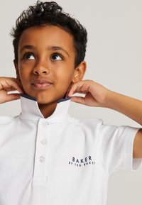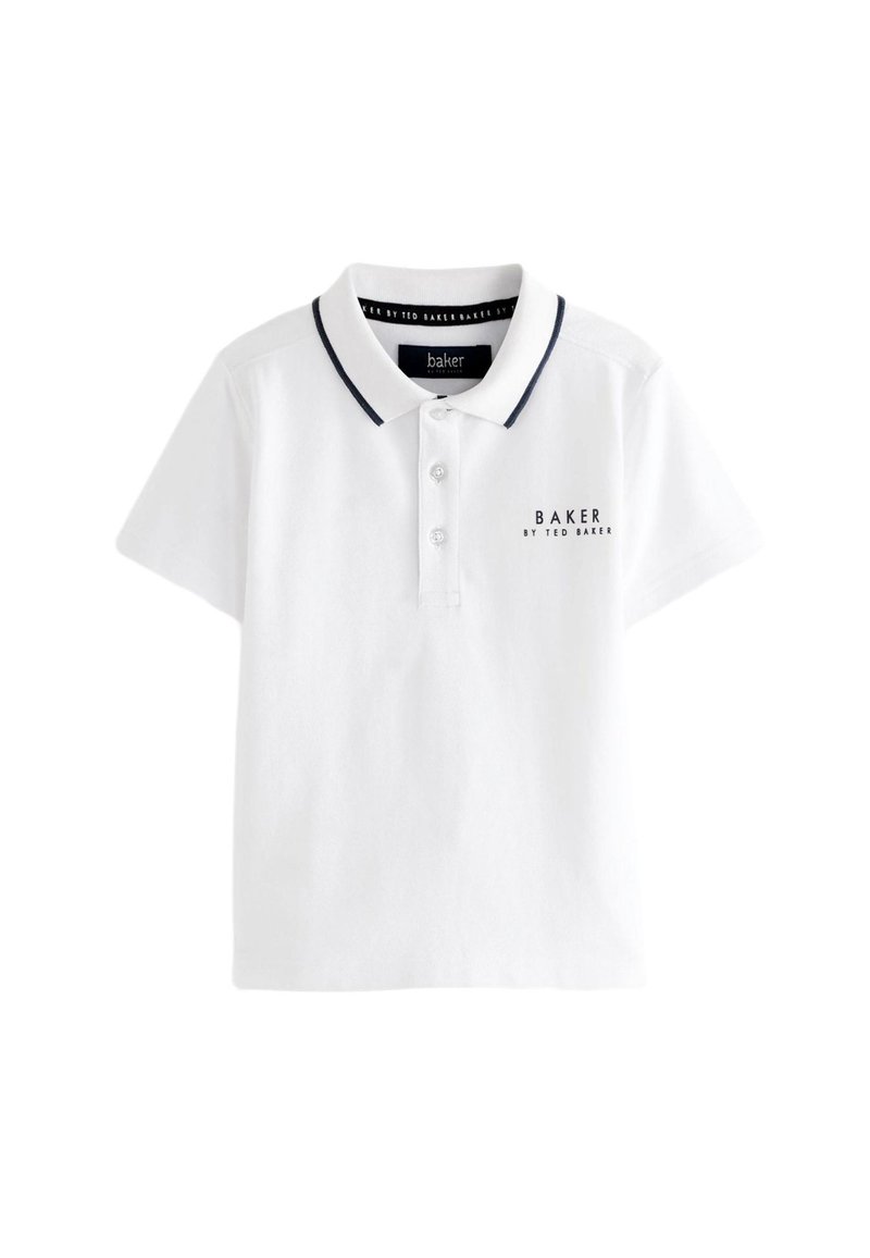 Weißes Polohemd mit kurzen Ärmeln und marineblauem Besatz am Kragen, Zweiknopfleiste und dem "BAKER by Ted Baker"-Logo auf der linken Brust.