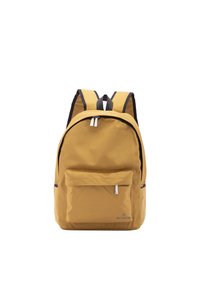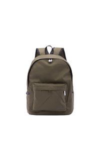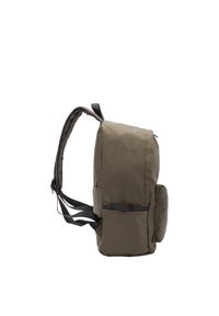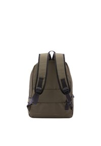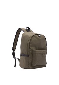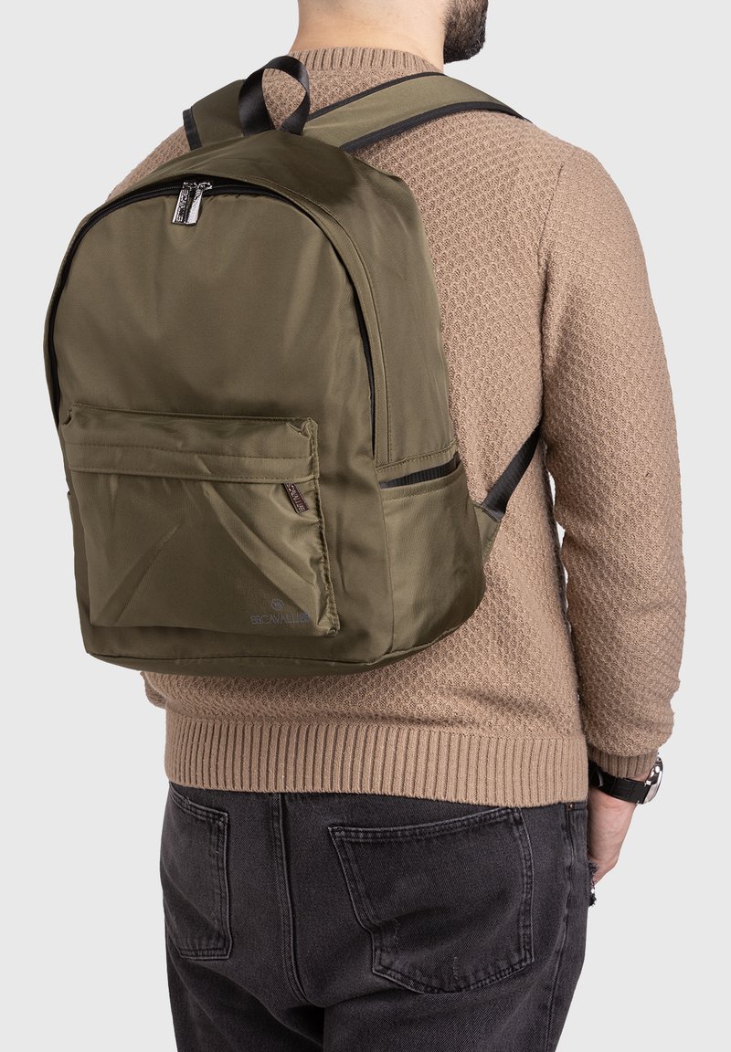 Mann trägt einen olivgrünen Rucksack mit Fronttasche, steht in einem beigen Strickpullover und dunklen Jeans, von hinten gesehen.