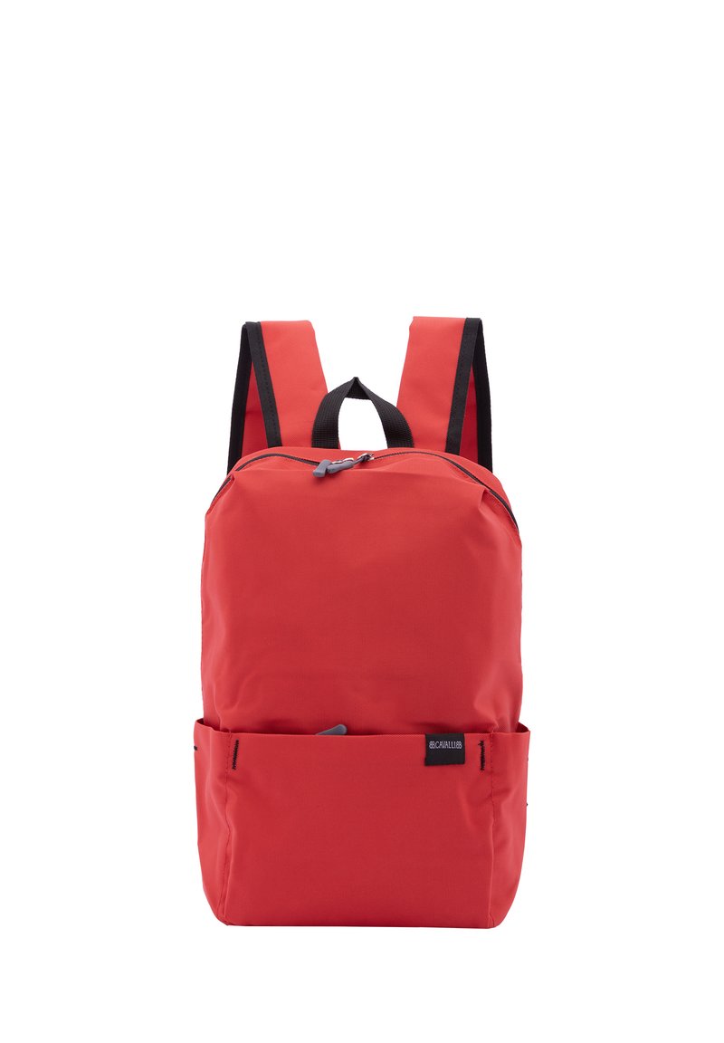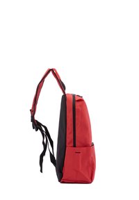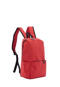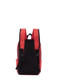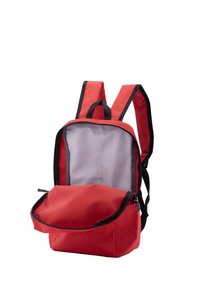 Roter Rucksack mit schwarzem Besatz an den verstellbaren Schultergurten, Hauptfach mit Reißverschluss vorne und offenem Frontfach mit schwarzem Markenlabel.