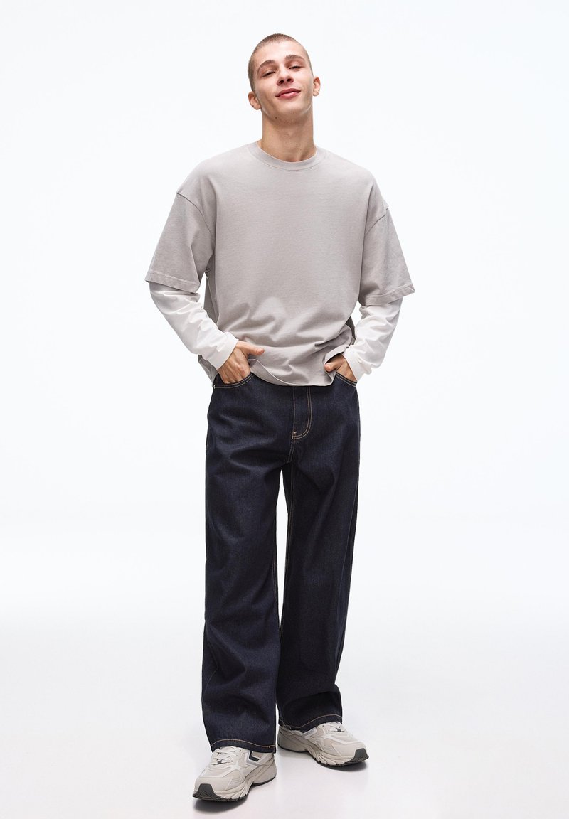 Junger Mann steht mit den Händen in den Taschen, trägt ein beiges übergroßes T-Shirt über einem weißen Langarmshirt, dunkle weite Jeans und weiße Turnschuhe.