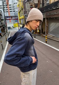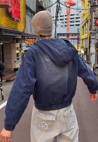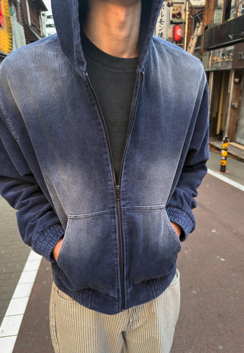 Person trägt einen blauen Corduroy-Kapuzenpullover mit Reißverschluss und Händen in den Taschen, steht auf einer Straße mit Gebäuden und Schildern im Hintergrund.