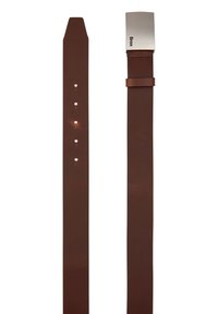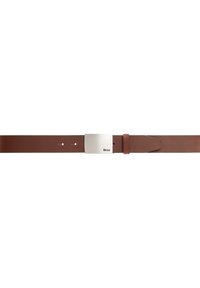 Brauner Ledergürtel mit einer rechteckigen silbernen Metallschnalle, die den Markennamen "Brax" trägt. Der Gürtel hat eine glatte Textur und ein schlichtes Design.