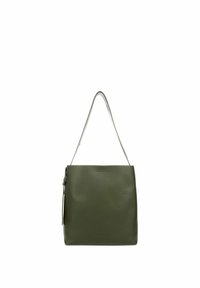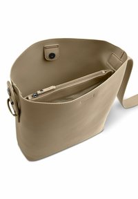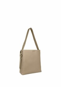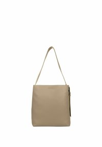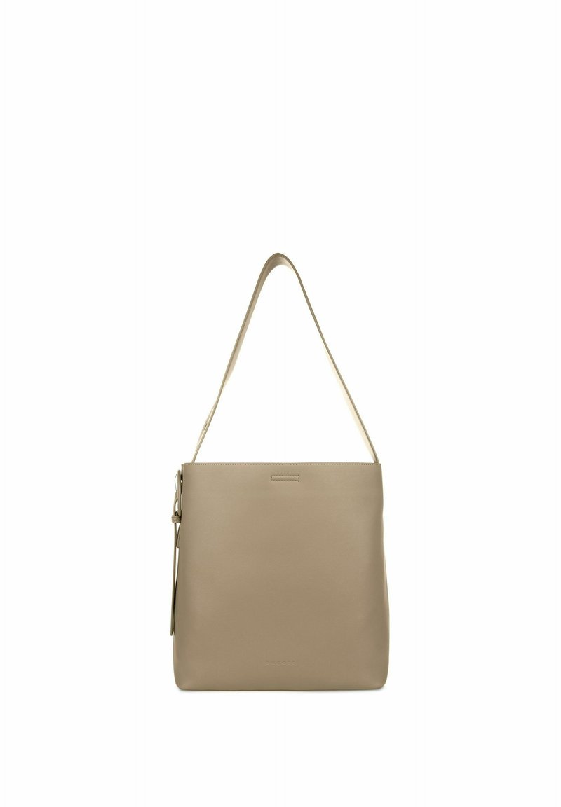 Beige Lederschultertasche mit flacher rechteckiger Form, einem einzelnen Tragegurt und seitlichem Reißverschlussdetail vor weißem Hintergrund.