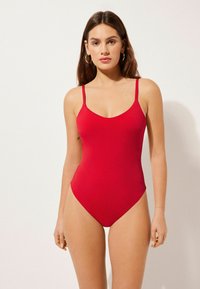 Roter Einteiler-Badeanzug mit dünnen Trägern, glatter Textur und mittlerem Ausschnitt; verfügt über einen Rundhalsausschnitt und hohe Beinausschnitte.