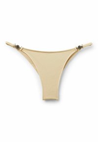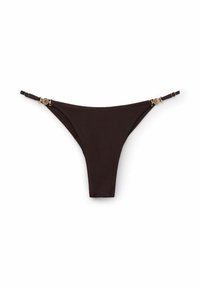 Schwarzer Bikiniunterteil mit einem tiefen Schnitt, der goldene Hardware-Akzente an den Seiten und eine glatte, leicht glänzende Stofftextur aufweist.