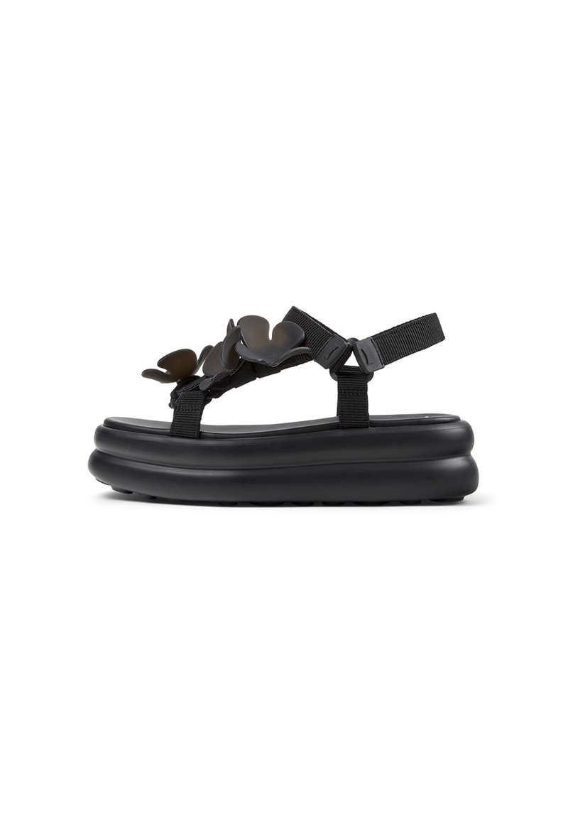 Schwarze Plateausandalette mit dicker Sohle, verstellbaren Riemen und dekorativen Schmetterlingsakzenten am oberen Riemen.