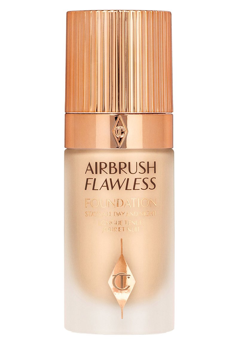 Airbrush Flawless Foundation in einer hohen, klaren Flasche mit einem goldenen gerippten Deckel; mit Branding und Ansprüchen, die in goldener Schrift aufgedruckt sind.