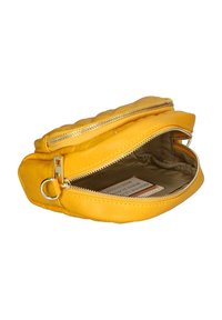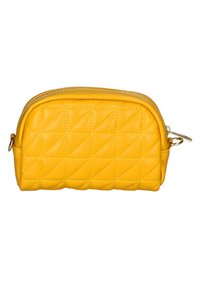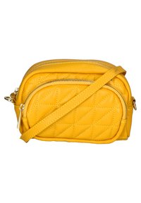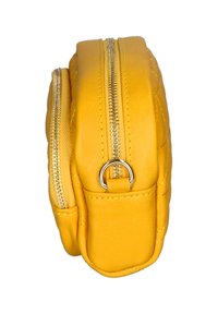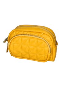 Gelbe gesteppte Tasche mit zwei Reißverschlussfächern und goldfarbenen Reißverschlussgriffen vor weißem Hintergrund.