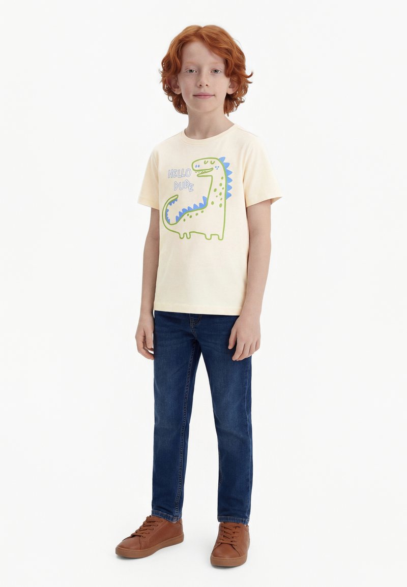Kind mit rotem Haar, das ein beiges T-Shirt mit einem grünen Dinosaurier-Motiv und dem Text "HELLO DUDE", blaue Jeans und braune Turnschuhe trägt und steht.