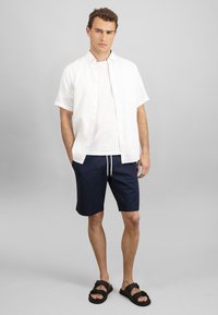 Kurzärmliges, geknöpftes Hemd in Hellgrau mit einer Brusttasche, kombiniert mit einem dunkelgrünen Unterhemd und beigen Hosen, gesichert durch einen geflochtenen braunen Gürtel.