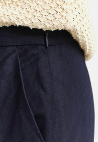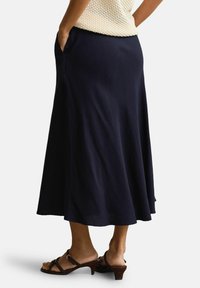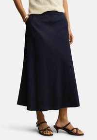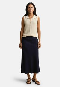 Frau trägt einen dunkelblauen Midirock, ein cremefarbenes ärmelloses Stricktop, ein silbernes Armband und braune Sandalen mit Absatz, steht mit den Händen in den Taschen.