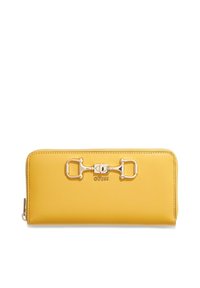 Gelbe Rundum-Reißverschluss-Brieftasche mit goldfarbenem Pferdebit-Detail und Guess-Logo auf der Vorderseite, glatte Lederoberfläche.
