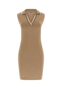 Frau trägt ärmelloses schwarzes Polokleid mit weißem Besatz und "GUESS"-Logo, steht vor einem schlichten hellen Hintergrund.