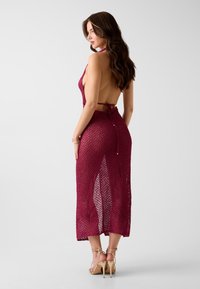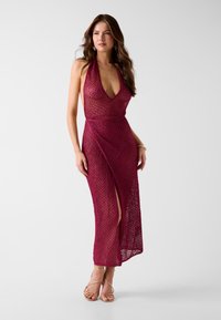Frau trägt ein ärmelloses, tiefrotes Häkel-Halfter-Kleid mit einem Oberschenkelschlitz, kombiniert mit goldenen Riemchenabsätzen und minimalem Schmuck.