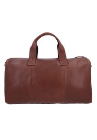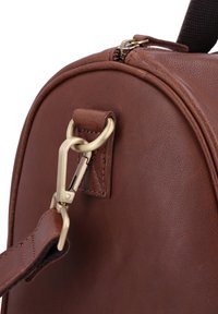 Braune Leder-Duffel-Tasche mit doppelten Griffen, glatter Textur und goldenen Reißverschlussdetails. Verfügt über eine vordere Reißverschlusstasche und eine abgerundete Form.