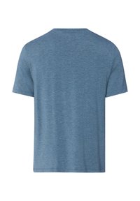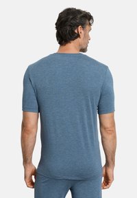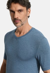 Mann mit kurzen dunklen Haaren und Bart, der ein blaues kurzärmeliges V-Ausschnitt-Shirt und passende Hose trägt, steht mit einer Hand in der Tasche.