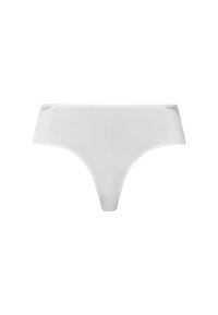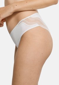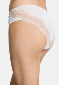 Frau trägt schlichte weiße Bikini-Unterwäsche mit Spitzendetails an den Hüften, steht mit locker an den Oberschenkeln hängenden Händen.
