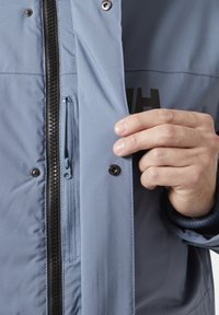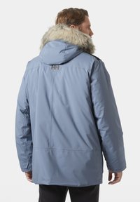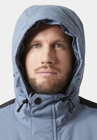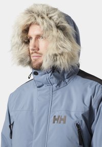 Mann trägt eine hellblaue Winterjacke mit pelzgefütterter Kapuze, schwarzen Reißverschlüssen und Fronttaschen, leicht nach rechts gewandt vor weißem Hintergrund.