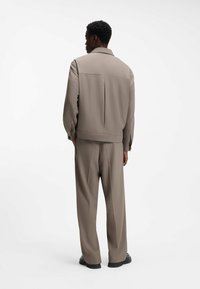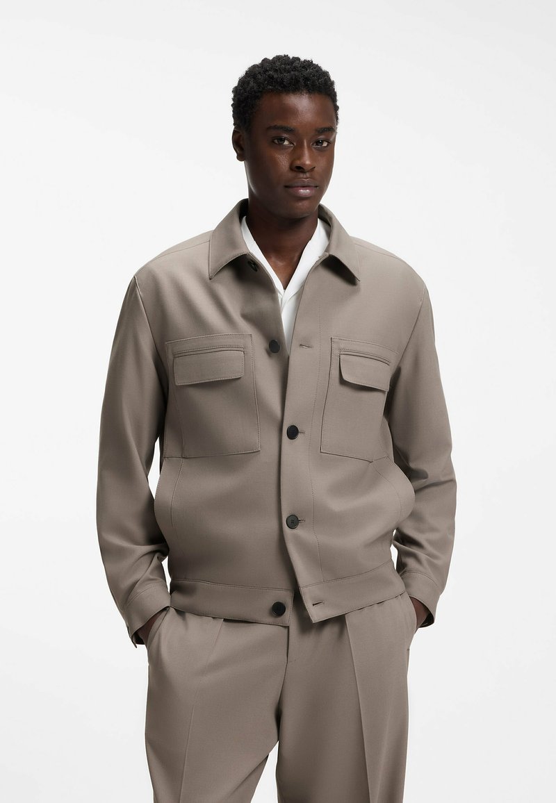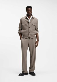 Mann trägt beige Jacke mit Knöpfen und Klappentaschen sowie passende Hose, steht mit den Händen in den Taschen vor weißem Hintergrund.