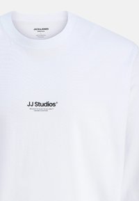 Zwei schlichte weiße Langarm-Shirts mit Rundhalsausschnitt, übereinander getragen, mit kleinem schwarzem "JJ Studios"-Schriftzug auf der Vorderseite.