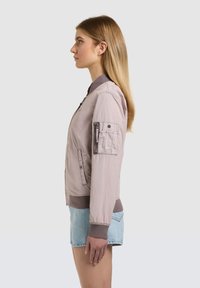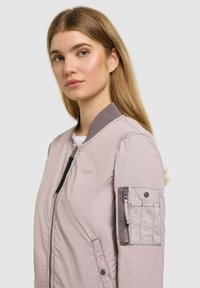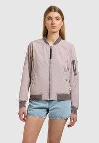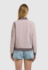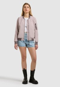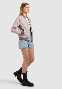 Junge Frau trägt eine hellmauvefarbene Bomberjacke mit Reißverschluss und hellblaue Jeansshorts und steht vor einem schlichten Hintergrund.