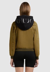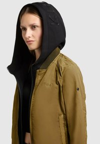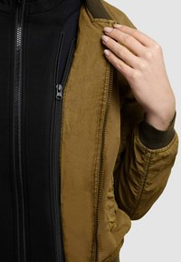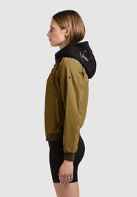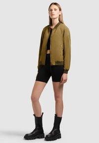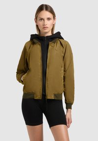Junge Frau trägt eine olivgrüne Bomberjacke über einem schwarzen Kapuzenpullover mit Reißverschluss und schwarzen Radsport-Shorts, sie steht vor einem einfarbigen Hintergrund.
