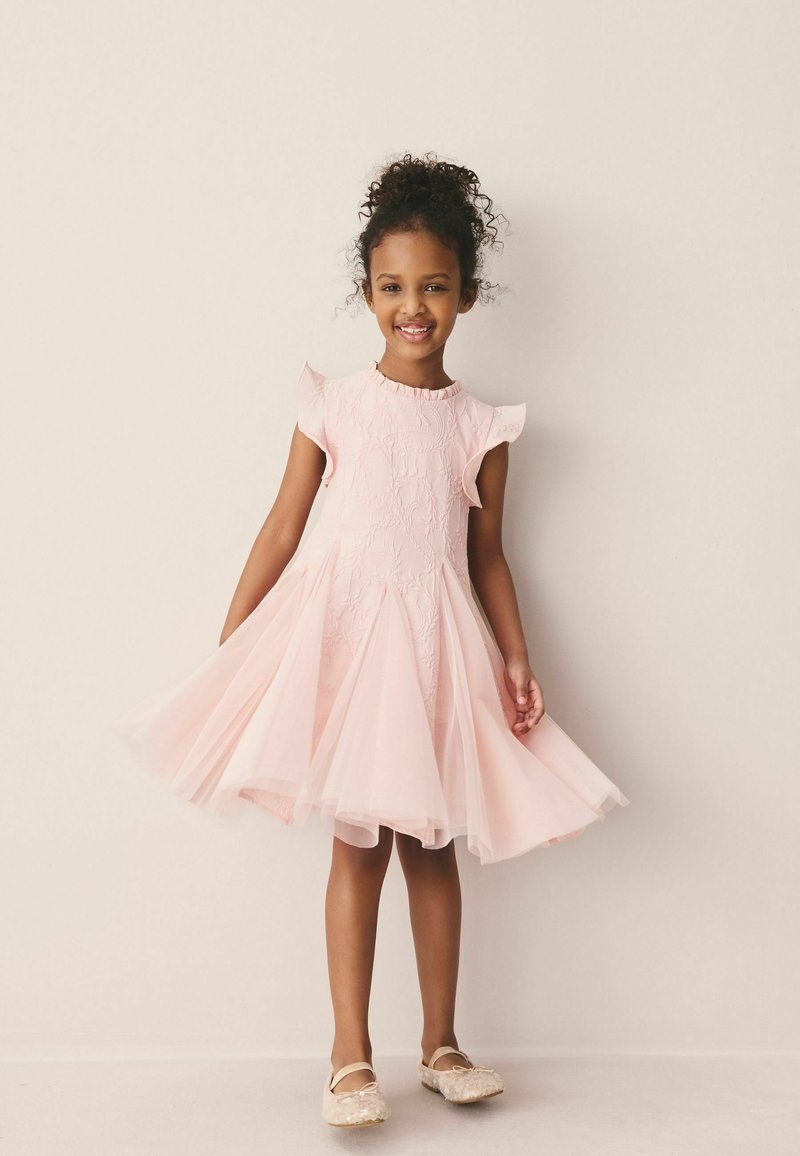 Junges Mädchen lächelt, während es sich in einem hellrosa ärmellosen Kleid mit strukturierten Details dreht und passende Ballettschuhe trägt.