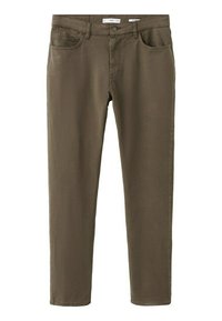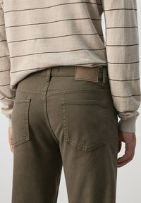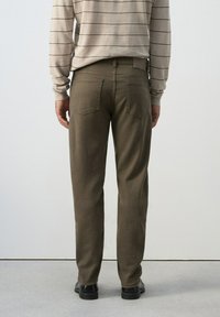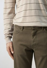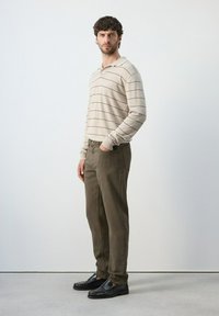 Mann trägt olivgrüne, gerade geschnittene Hose, beige langärmliges gestreiftes Hemd und schwarze Lederloafer, steht vor einem neutralen Hintergrund.