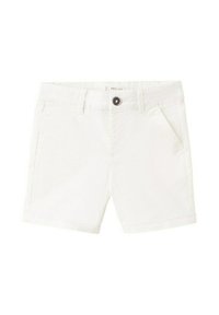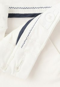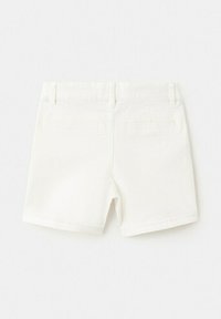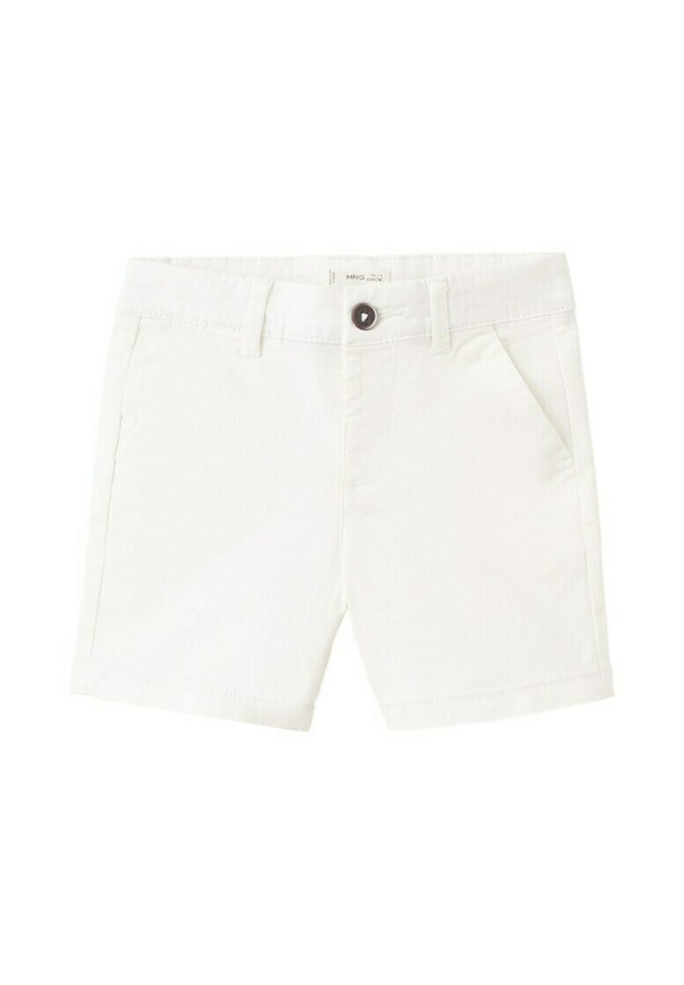 Weiße Baumwollshorts mit vorderen Taschen, Gürtelschlaufen und einem dunklen Knopfverschluss am Bund.
