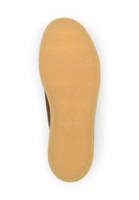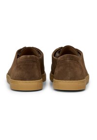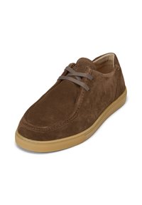 Brauner Wildleder-Schnürschuh für die Freizeit mit einer hellbraunen Gummisohle, Nahtdetails und niedrigem Schaft, seitlich auf weißem Hintergrund dargestellt.