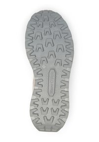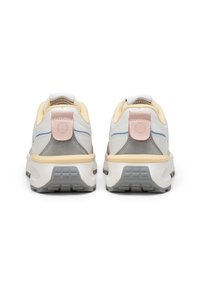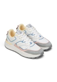 Weißer Sneaker mit grauen, blauen und pastellpinken Akzenten. Verfügt über eine strukturierte Wildleder-Zehenkappe, ein strukturiertes Design und eine robuste Gummisohle.