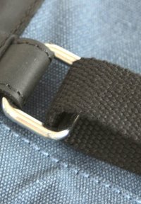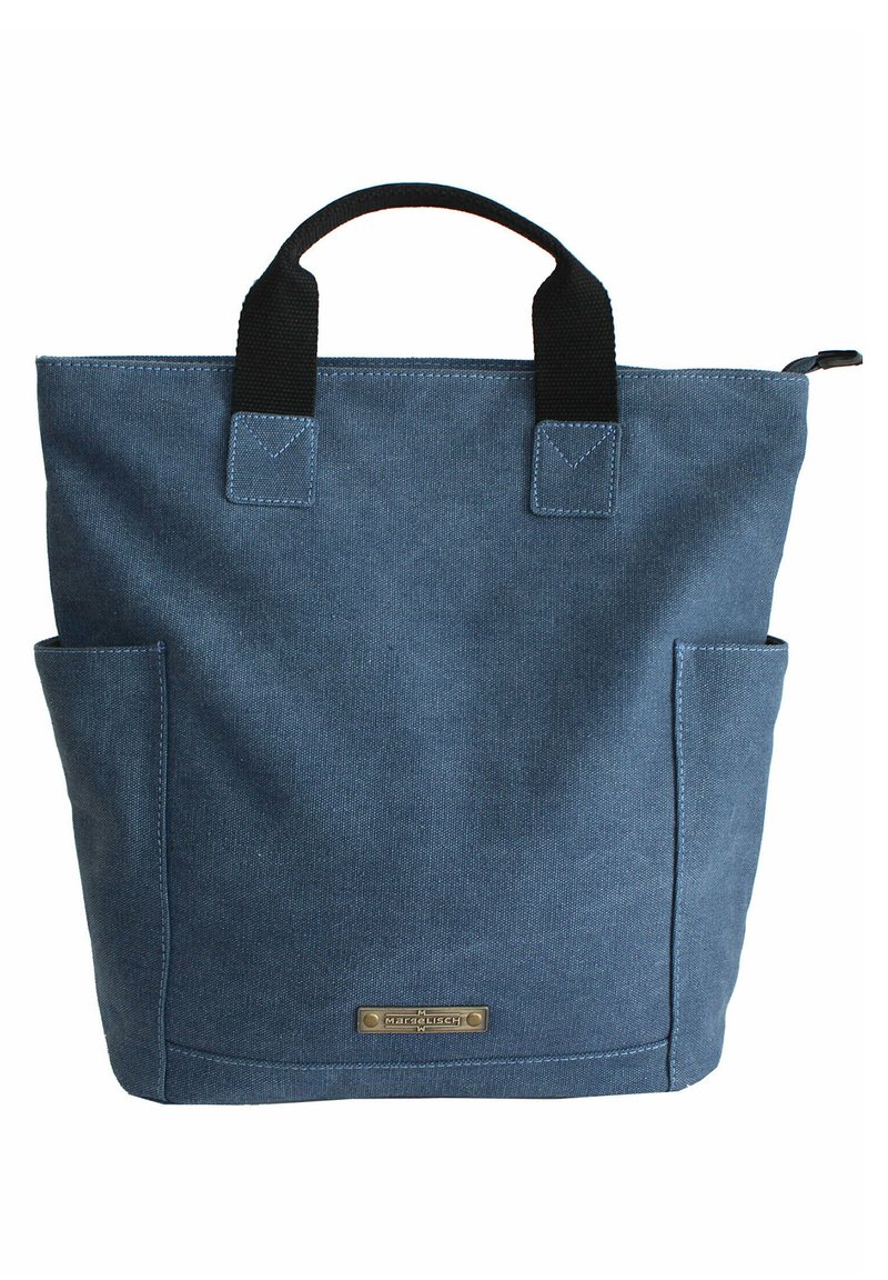 Blauer Baumwolltasche mit schwarzen Stoffgriffen, zwei Seitentaschen und einer Metall-Logo-Plakette. Robuste Konstruktion mit verstärkten Nähten.