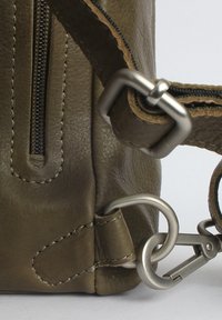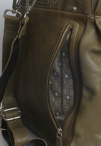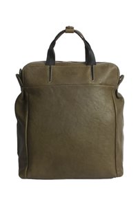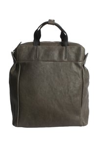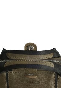 Olivgrüne Lederhandtasche mit schwarzen Griffen, rechteckiger Form, Reißverschluss, minimaler Naht und einem auf der Vorderseite eingeprägten Logo.