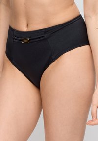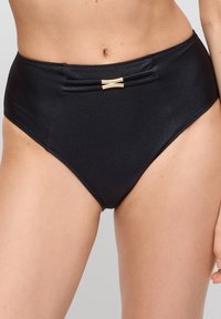 Frau mit blondem Haar, die einen schwarzen Bikini mit goldenen Akzenten trägt, steht vor einem schlichten hellen Hintergrund und schaut nach vorne.
