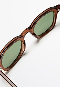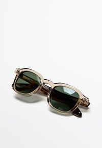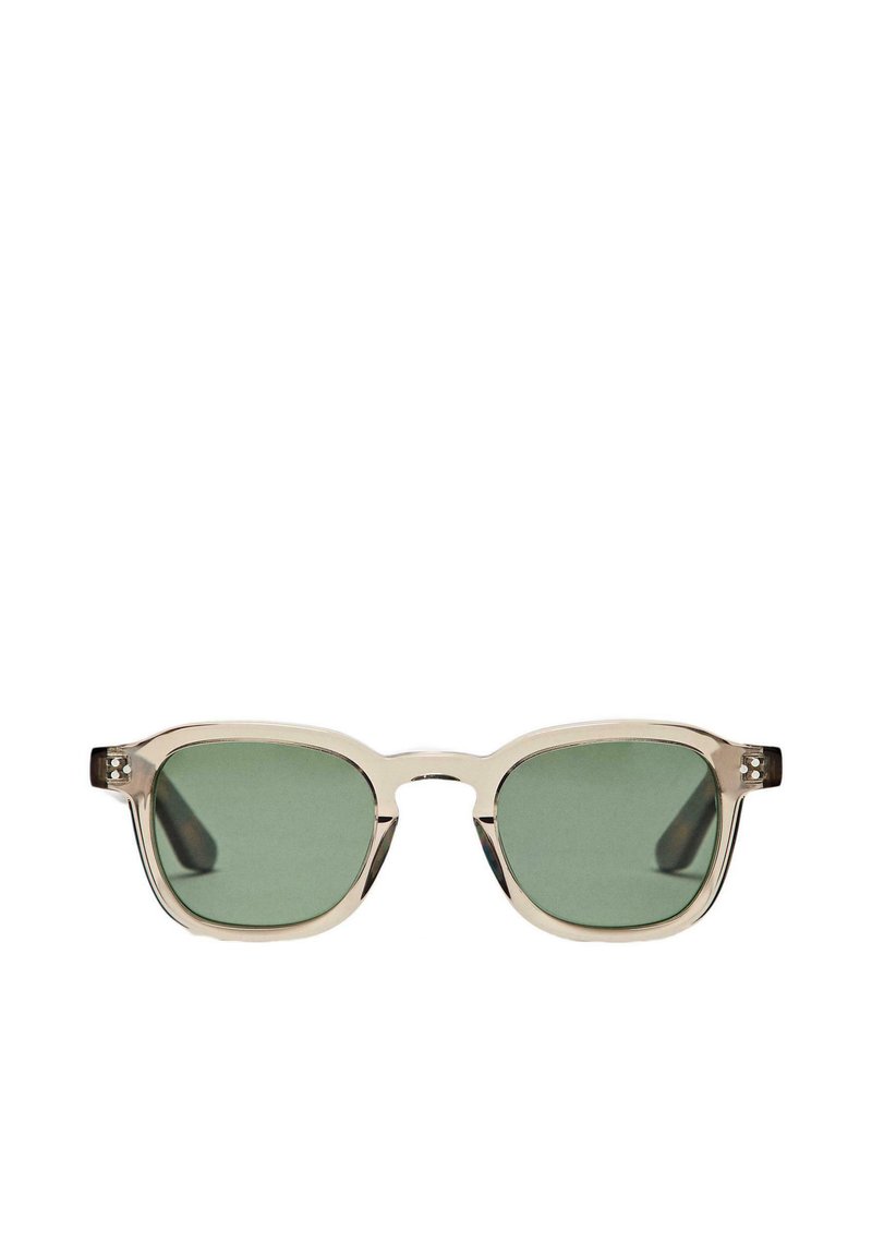 Transparente beige eckige Sonnenbrille mit grün getönten Gläsern, Kunststoffrahmen und kleinen silbernen Akzenten nahe den Scharnieren.