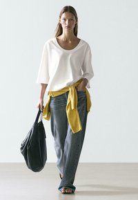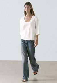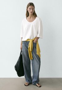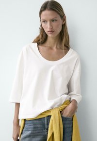Frau trägt ein locker sitzendes weißes T-Shirt mit weitem Rundhalsausschnitt, dreiviertellangen Ärmeln und blauer Jeans, steht vor einfachem Hintergrund.