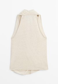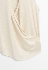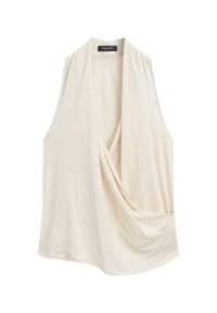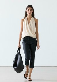 Frau mit langen dunklen Haaren, die ein ärmelloses beiges Wickeltop und schwarze Hosen trägt, stehend vor einem schlichten hellen Hintergrund.