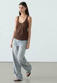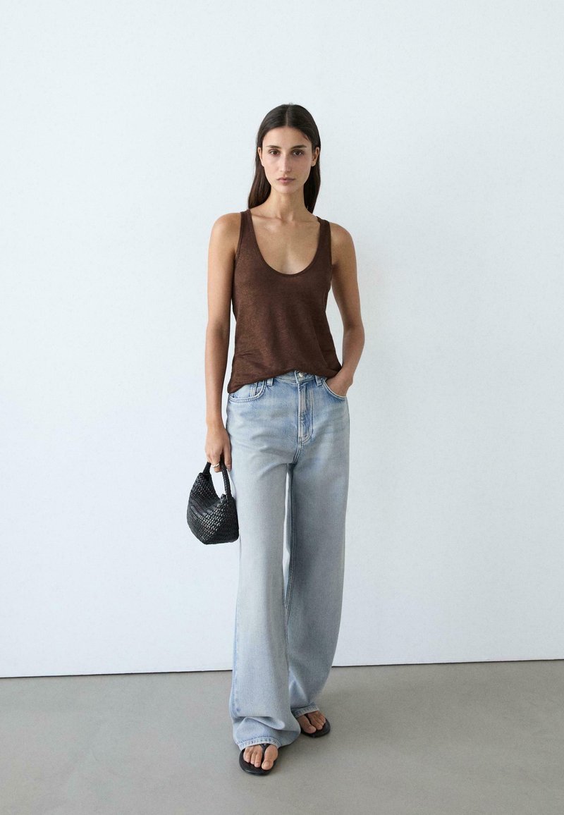 Frau steht vor einer weißen Wand, trägt ein braunes ärmelloses Oberteil, hellblaue weite Jeans, schwarze Sandalen und hält eine kleine schwarze Handtasche.