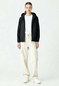 Frau mit hellem Teint und zurückgebundenem Haar trägt eine schwarze Kapuzenjacke und cremefarbene Cargo-Hosen und steht vor einem schlichten, hellen Hintergrund.