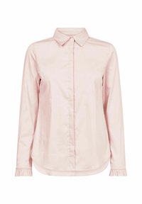 Helle beige Langarmbluse mit Kragen, Rüschensäumen und Knopfverschluss, aus glattem Stoff und taillierter Form.