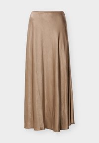 Brauner Satin-Maxi-Rock mit einem elastischen Bund, der eine glatte Textur und einen leichten Glanz aufweist, kombiniert mit kremfarbenen flachen Schuhen.