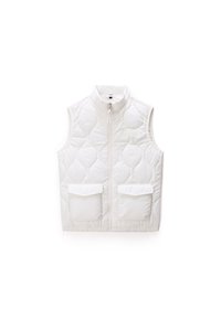 Helles blaues, gestepptes Weste mit hohem Kragen, Frontreißverschluss und zwei Fronttaschen. Kombiniert mit einem gestreiften Kurzarmhemd und schwarzen Shorts.