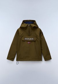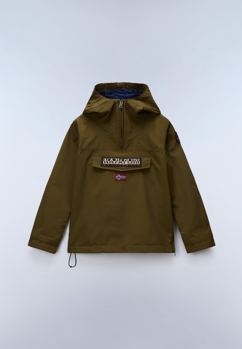 Olivgrüne Kapuzenjacke mit halbem Reißverschluss, Frontklappe mit „Napapijri“-Logo und norwegischer Flaggenaufnäher unter der Tasche.