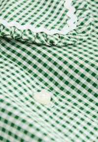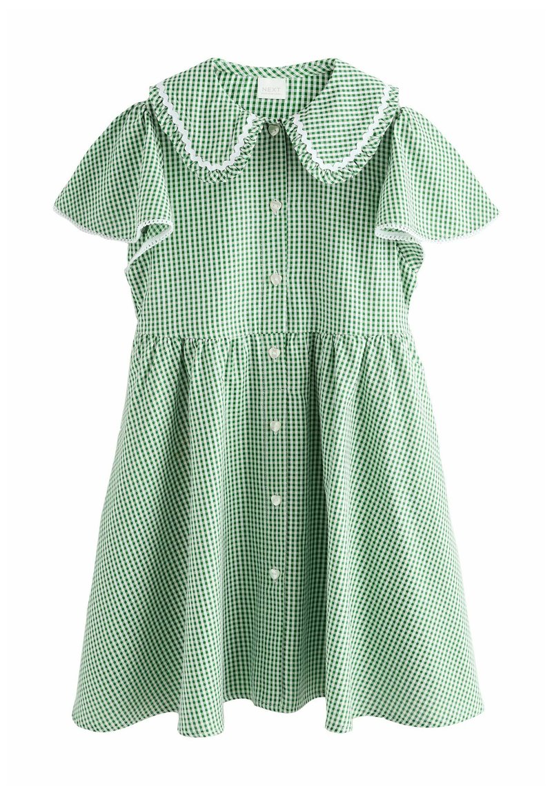 Grünes und weißes karierte Kleid mit gezacktem Peter-Pan-Kragen, Rüschenärmeln, Knopfleiste vorne und geraffter Taille.