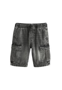 Denim-Cargo-Shorts mit elastischem Bund und Kordelzug, ausgestattet mit zwei Seitentaschen und einem hellblauen Waschung. Kombiniert mit weißen Socken und Sneakers.