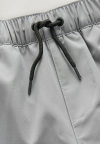 Schwarze Badeshorts aus glattem Stoff mit elastischem Bund und Kordelzug sowie seitlichen Taschen, mit einem leichten Seitenschlitz am Saum.