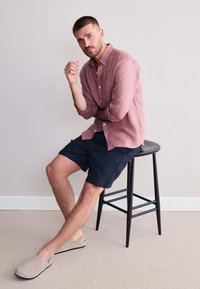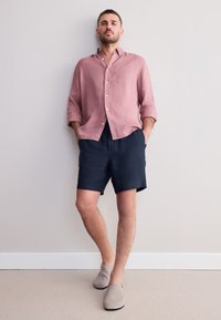 Hellrosa Leinenhemd mit aufgekrempelten Ärmeln und Knopfleiste, kombiniert mit dunkeln marineblauen Leinen-Shorts mit elastischem Bund.