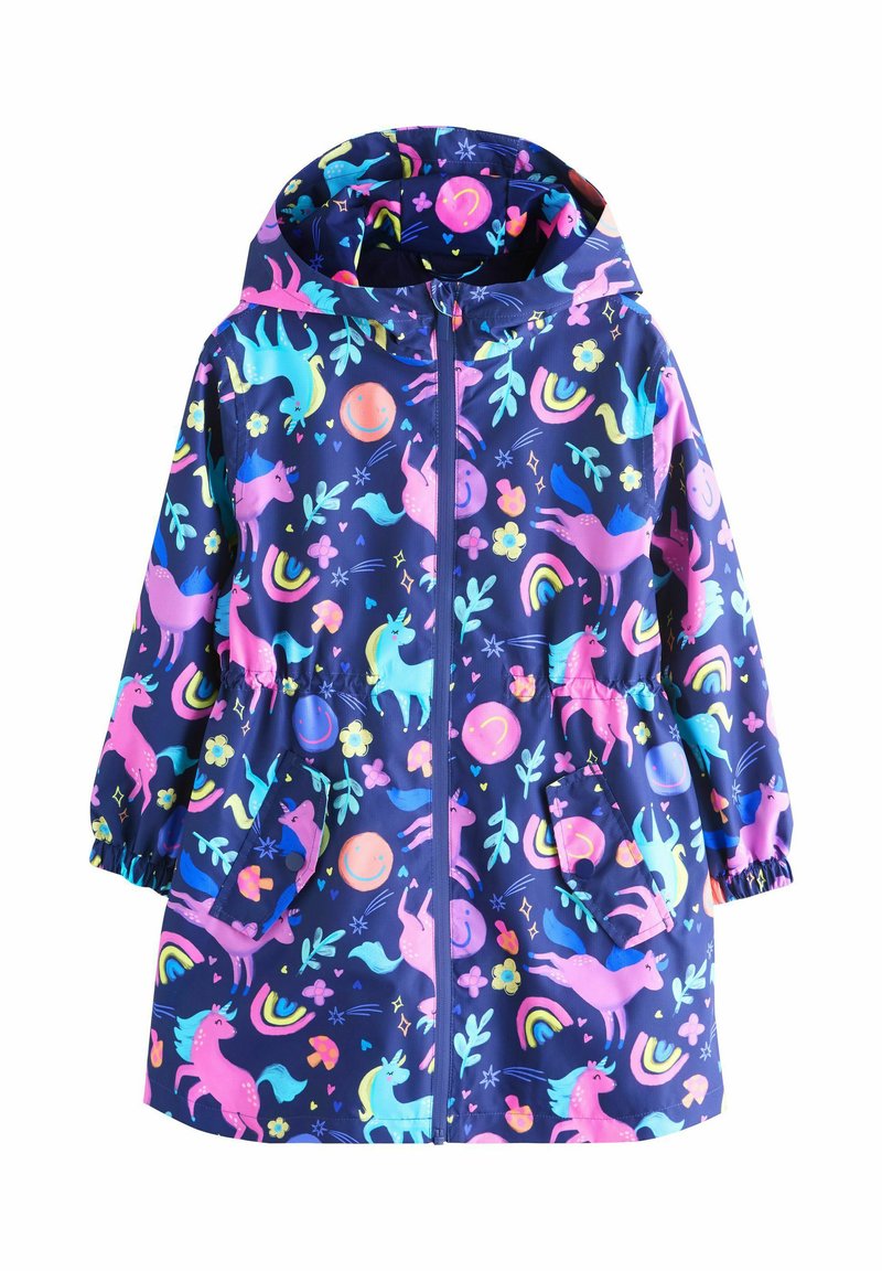 Navyblauer Regenmantel mit einem verspielten Einhorn- und Blumenmuster in lebhaftem Pink, Blau und Grün. Mit Kapuze und elastischen Bündchen ausgestattet.