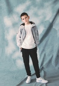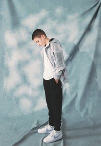 Junge mit kurzem blondem Haar, trägt ein weißes übergroßes T-Shirt mit dem Wort "oasis" in einem schwarzen Rechteck, die Hände in den Taschen dunkler Hosen.